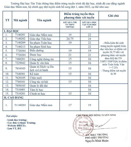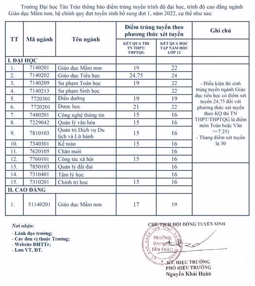 Trường ĐH Tân Trào thông báo điểm trúng tuyển trình độ đại học, cao đẳng ngành Giáo dục mầm non, hệ chính quy, tuyển sinh bổ sung đợt 1 năm 2022.