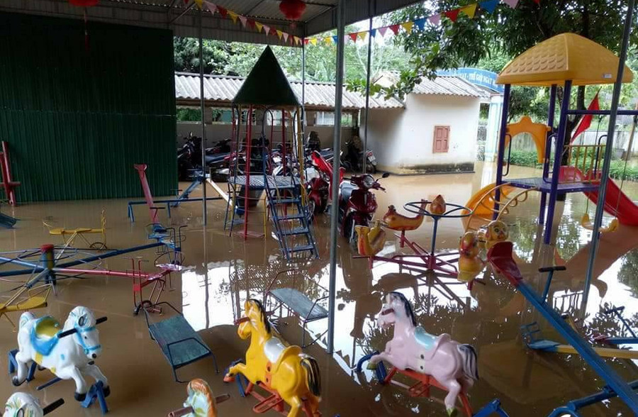 | Tại trường mầm non Thọ Sơn (Anh Sơn), mưa lớn gây ngập lụt toàn bộ khu vực trường. Học sinh vẫn đang trong thời gian nghỉ học, chờ nước rút để đi học lại. |