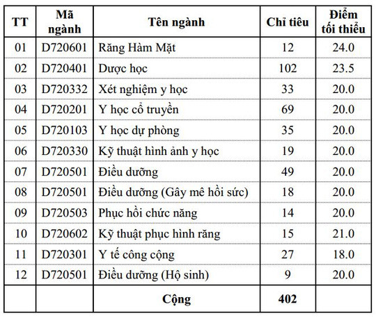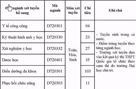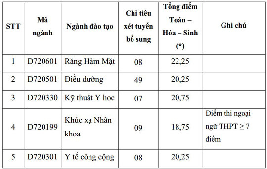 Trường ĐH Y Thái Bình tuyển bổ sung 5 ngành đào tạo gồm: Y đa khoa (139 chỉ tiêu), điểm nhận hồ sơ 22; Y học cổ truyền (25 chỉ tiêu), điểm nhận hồ sơ 21; Y học dự phòng (19 chỉ tiêu), điểm nhận hồ sơ 21; Y tế công cộng (6 chỉ tiêu), điểm nhận hồ sơ 20; Dược học (35 chỉ tiêu), điểm nhận hồ sơ 21,5.