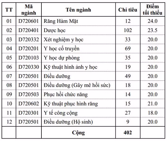 Đầu tiên, dựa vào kết quả thi THPT các môn sau để xét tuyển từ cao xuống thấp: Môn Hóa học cho ngành Dược học; Môn Sinh học cho các ngành lại. Nếu số thí sinh được chọn ở bước này vẫn vượt quá chỉ tiêu được giao, các thí sinh sẽ được xét tuyển dựa vào điểm thi môn ngoại ngữ trong kỳ thi THPT. Các thí sinh không có điểm môn ngoại ngữ sẽ không được xét ở bước này.