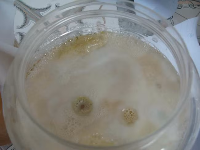 Từ từ trên bề mặt hỗn hợp sẽ đóng thành một lớp váng màu trắng đục, đây chính là con giấm. Thời gian này diễn ra trong khoảng từ 45 đến 60 ngày. (Ảnh: Internet)