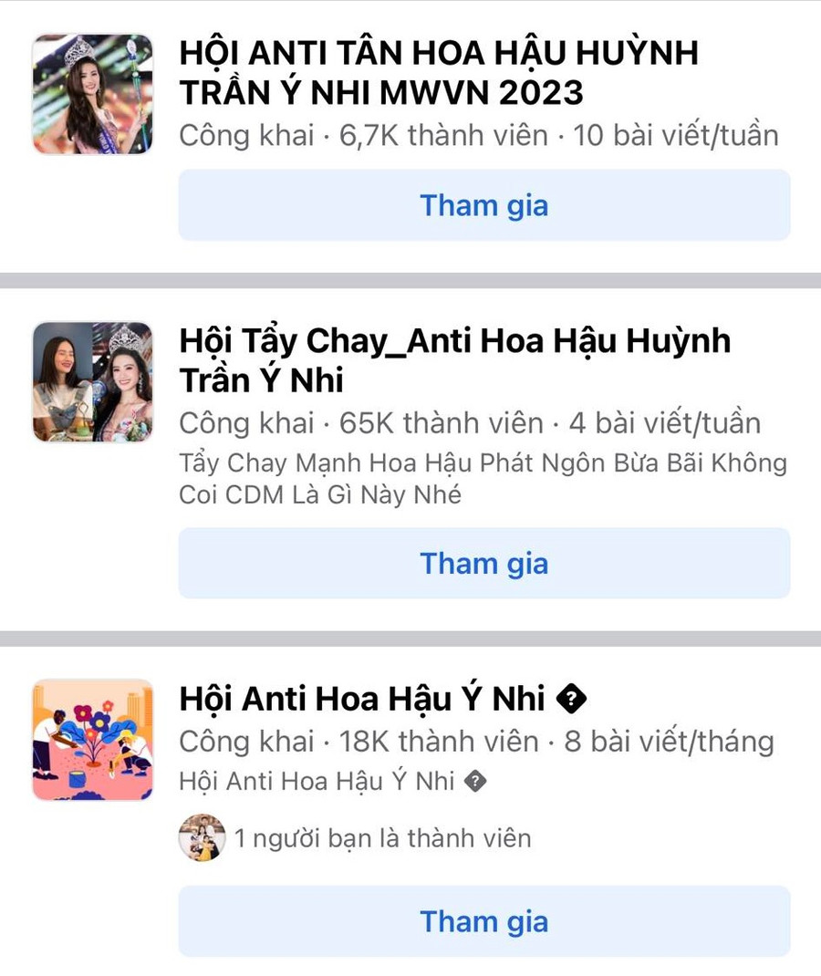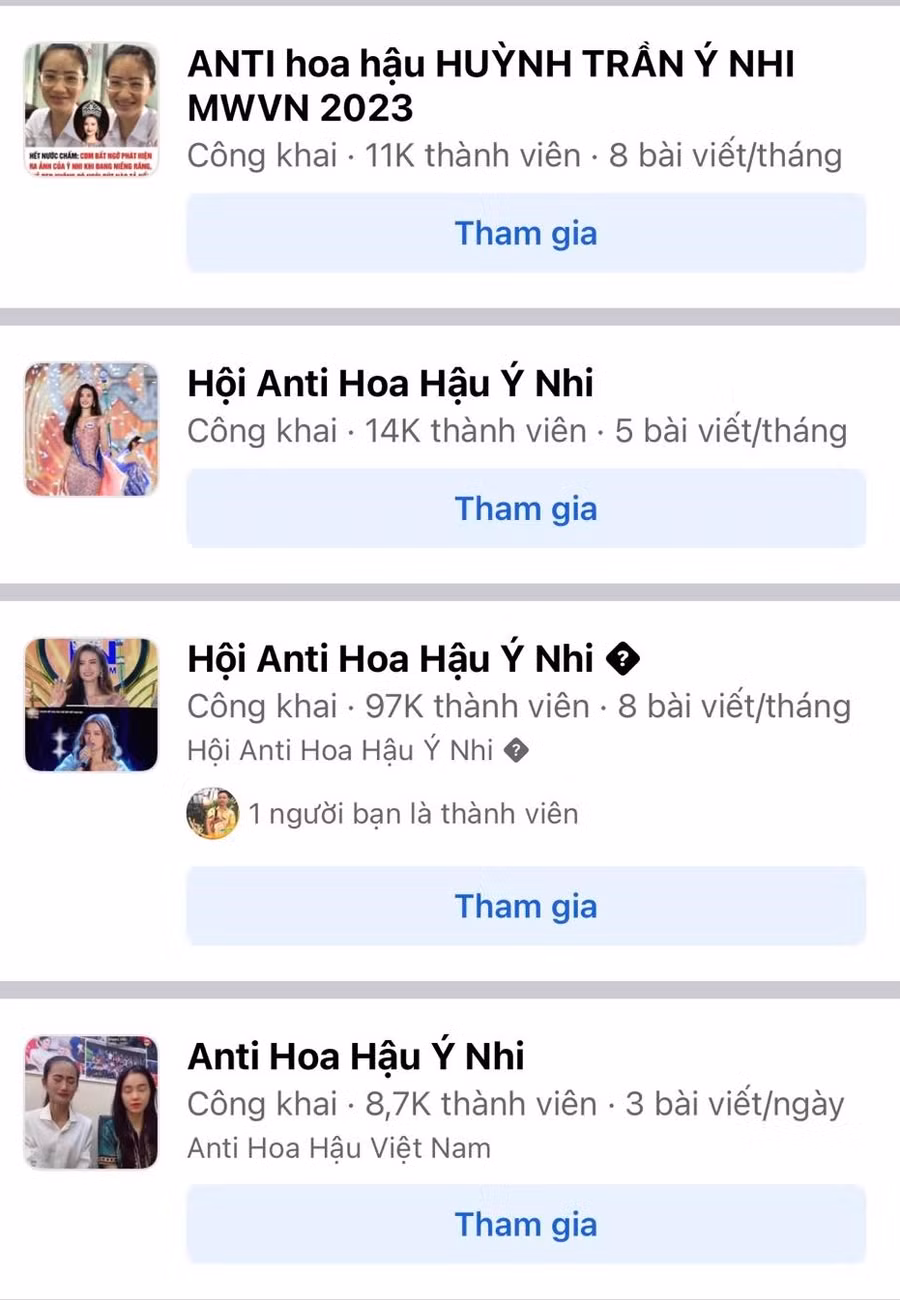 | Đã có rất nhiều hội nhóm anti Hoa hậu Ý Nhi được mọc lên, thậm chí có nhóm còn thu hút gần 500 nghìn thành viên tham gia. |