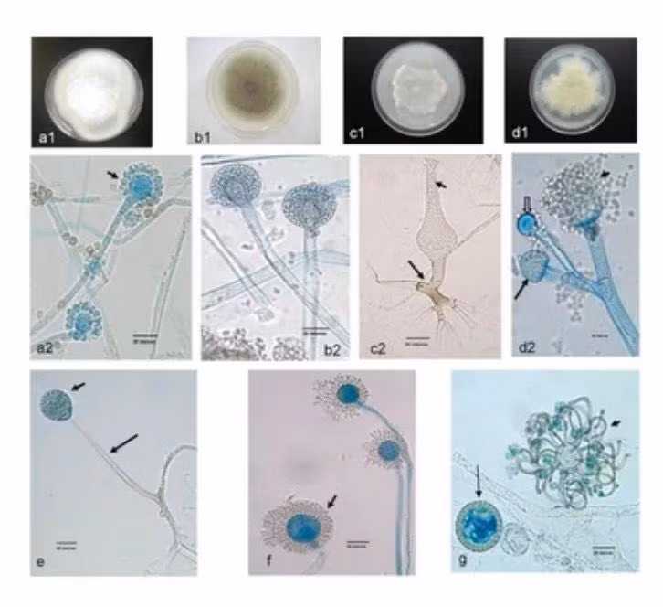 Nhóm nấm Mucor tạo ra hàng triệu bào tử (cấu trúc hình cầu cực nhỏ, màu sẫm) lơ lửng trong không khí.