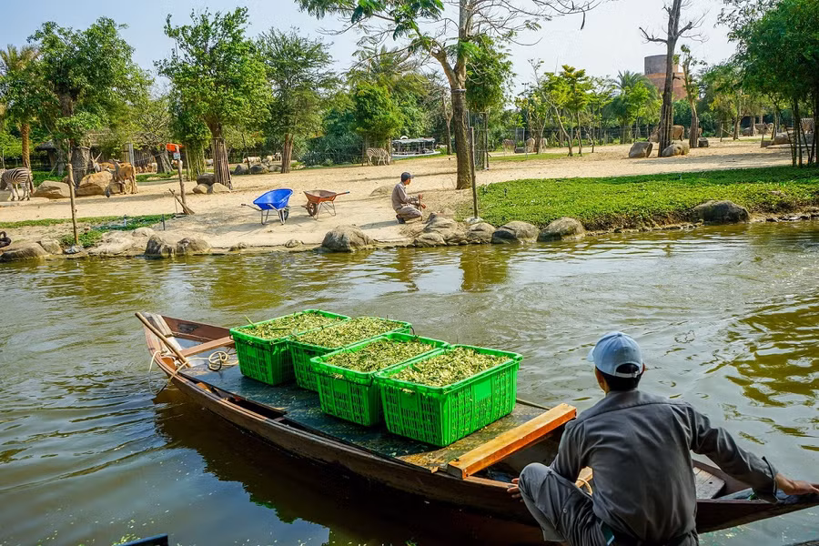 “Vì tất cả khu vực chuồng trại của các loài động vật đều ở trên mặt nước hoặc dọc theo sông, nên việc di chuyển để chăm sóc hay cung cấp thức ăn đều phải dùng thuyền. Việc này vừa đòi hỏi lộ trình chặt chẽ, vừa đặt ra những “thử thách” không dễ gì mới có thể quen được. Cùng là bó cỏ khô 20kg cho voi ăn, vốn đã không dễ dàng mang vác khi đứng trên mặt đất, lại càng dễ mất sức hoặc té ngã khi di chuyển trên chiếc thuyền chông chênh, lắc lư”, chị Thiểm kể. “Đó là chưa kể những đợt tiếp nhận, vận chuyển, đưa thú ra sống ở các ốc đảo mới. Cỡ như hổ, sư tử thì trọng lượng cả tạ là bình thường. Anh em gắng sức xoay sở giữ thăng bằng trên sông với khung lồng khổng lồ nhưng không ai bảo ai đều rất nhẹ nhàng khi nhấc lên, đặt xuống. Mỗi bước đi, mỗi khâu đều phải phối hợp tỉ mỉ, chính xác để tránh cho các bạn thú bị rung lắc mạnh, có thể bị giật mình và hoảng loạn”.