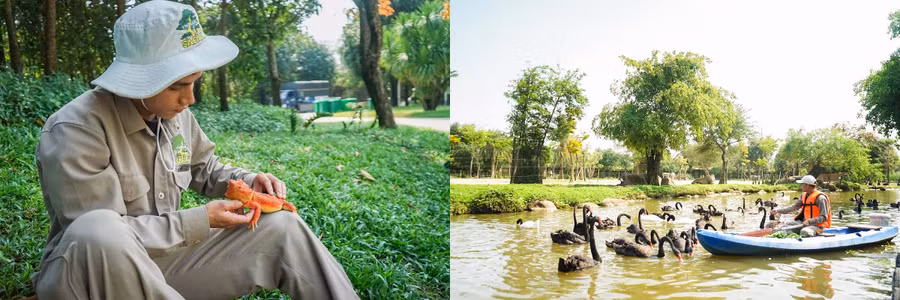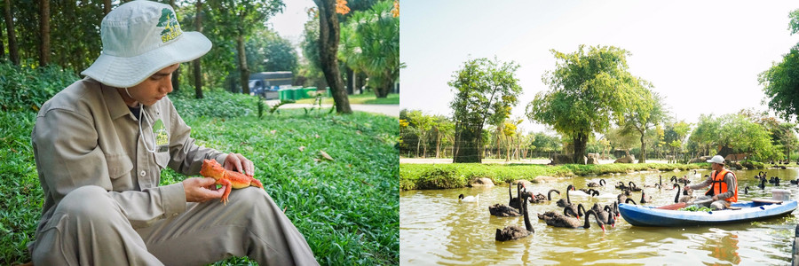 Không quản ngày đêm, đội ngũ nhân viên chăm sóc, bảo vệ động vật hoang dã tại River Safari Nam Hội An thuần thục lênh đênh trên những chiếc thuyền di chuyển từ khu hồ thiên nga sang lãnh địa của sư tử châu Phi, chúa sơn lâm oai hùng… chăm sóc từng miếng ăn, giấc ngủ cho hàng nghìn cá thể tại đây.