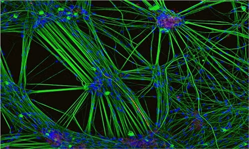 Các tế bào não phát triển từ tế bào da người chụp dưới kính hiển vi và sợi trục thần kinh liên kết với chúng.