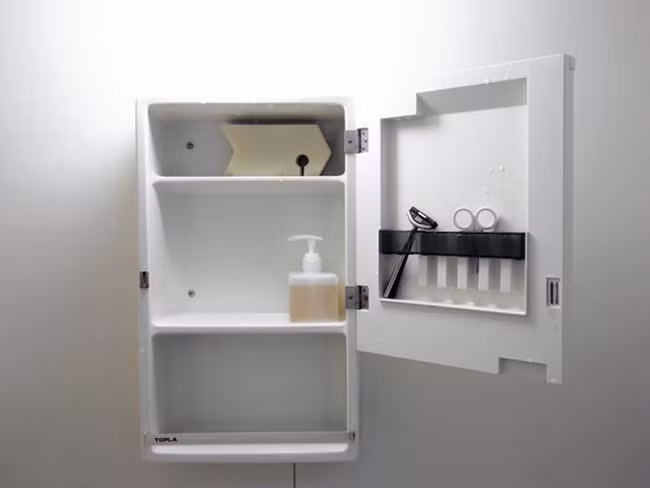 Tủ đựng đồ trong nhà tắm chỉ chứa những vật dụng cần thiết nhất.