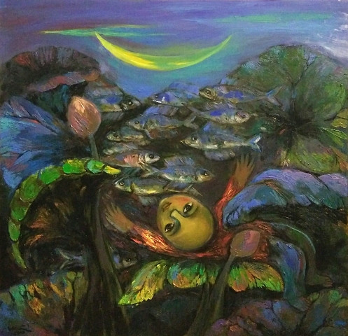 -Một mảng đề tài khác trong tranh của anh là những bức vẽ về sen. Khác với các họa sĩ khác, hoa sen trong tranh của anh rất ít, chủ yếu là những chiếc lá sen cuối mùa tàn úa, quăn lại trước làn gió mùa đầu Thu. Ẩn hiện trong đám lá sen cằn cỗi kia là những thiếu nữ mịn màng, tinh khiết đến lạ lùng. Anh có thể nói đôi chút để người xem hiểu hơn?