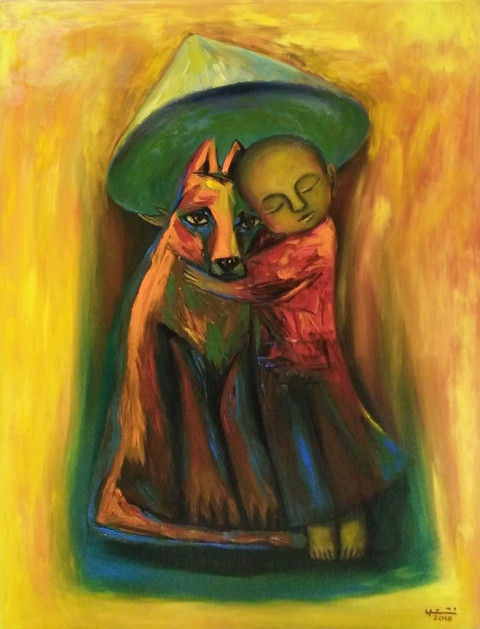 -Tôi vẽ những gì đang hiện hữu quanh ta, ví dụ như một em bé ôm ghì lấy chú cún trong tác phẩm “Đôi bạn”. Em bé nhắm mắt, miệng mỉm cười, hạnh phúc ngả đầu về chú chó ngồi vững vàng như một vệ sĩ sẵn sàng bảo vệ chủ nhân. Tự bức tranh đã toát ra một năng lượng tình cảm vô cùng mạnh mẽ giữa cậu bé và chó trung thành.