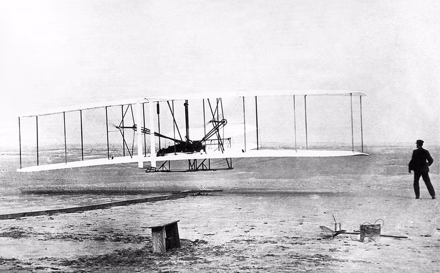 Khi anh em Wright đến North Carolina để thử chiếc máy bay lần đầu tiên, họ phải quyết định ai sẽ là người đầu tiên lái máy bay đi vào sử sách của nhân loại. Để cho công bằng, họ chọn cách tung đồng xu, và Wilber thắng. Tuy nhiên, anh lại gặp thất bại, chiếc máy không cất cánh được và bị hư hỏng nhẹ. Sau khi được sửa chữa, tới phiên Orville bay. Vào ngày 17/12/1903, chiếc máy bay cơ khí đầu tiên đã bay trên quãng đường khoảng 36m, mất 12 giây trên không.