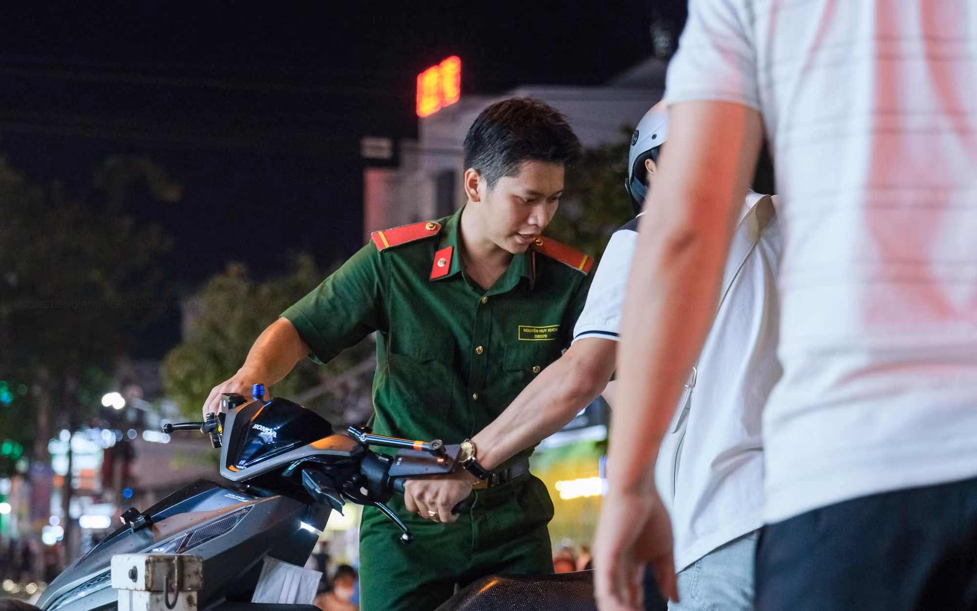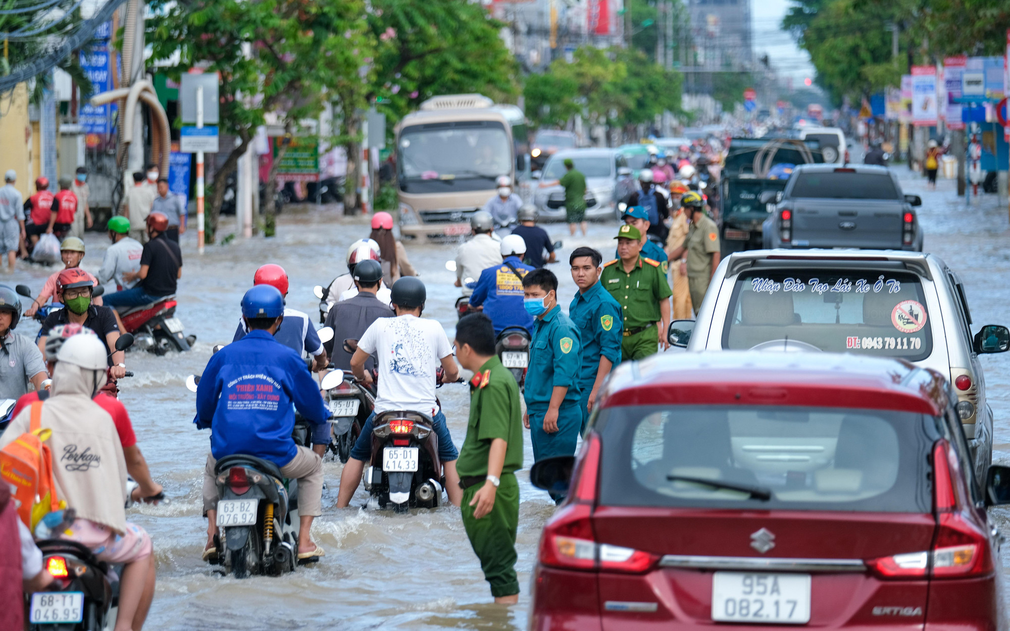 | Các chiến sĩ công an không chỉ tham gia hỗ trợ phân luồng trên các tuyến đường ngập mà còn giúp người dân có xe chết máy vượt trũng ngập. |