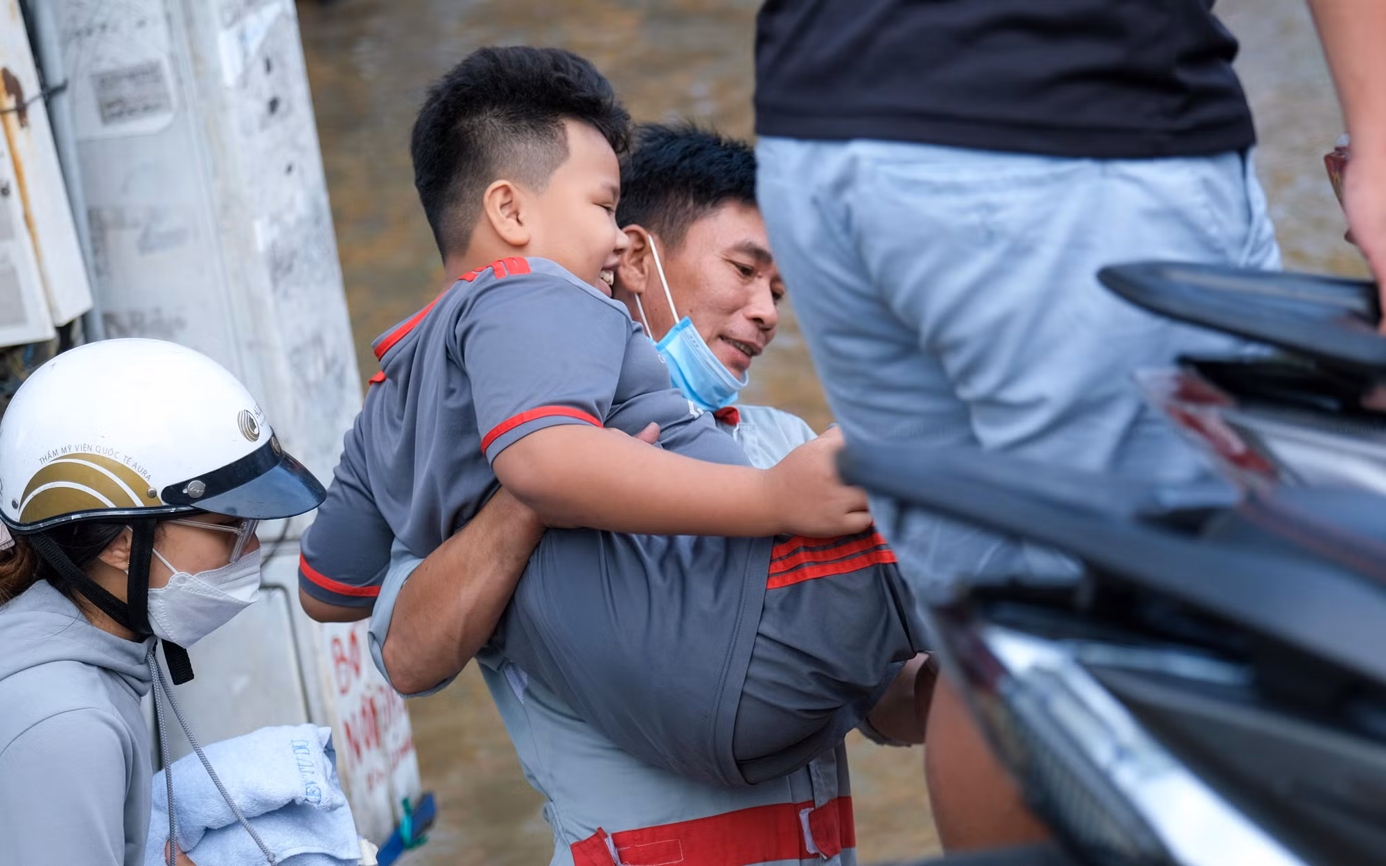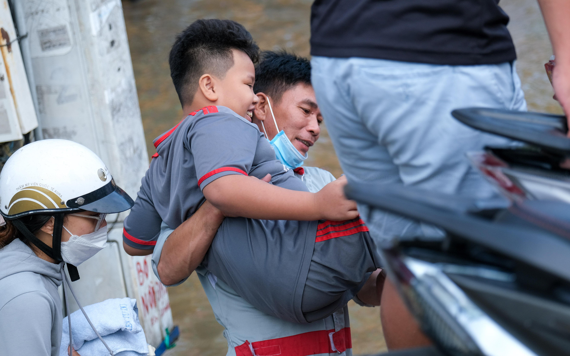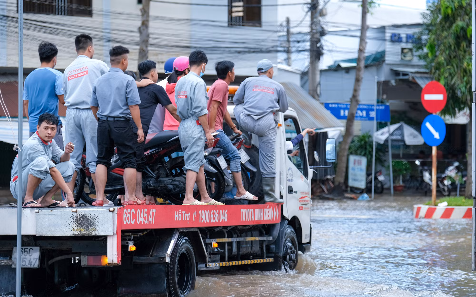 | Các chuyến xe đón cả người lẫn xe máy ở bất cứ điểm ngập nào. |