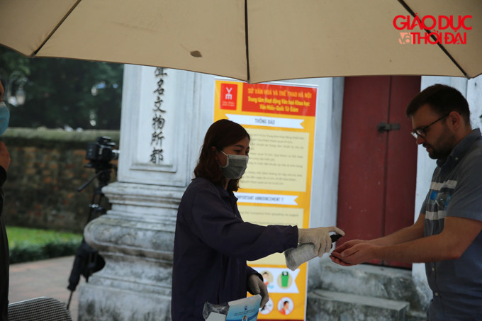 | Tại phía bên ngoài, nhân viên của di tích đã hướng dẫn, xịt nước rửa tay kháng khuẩn cho du khách. |