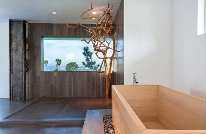 Sự có mặt của cây cảnh hay bonsai có trong phòng tắm sẽ giúp mọi người cảm thấy thư thái hơn khi tận hưởng cảm giác mát lành ngâm mình trong bồn tắm như đang được tắm giữa khung cảnh thiên nhiên.