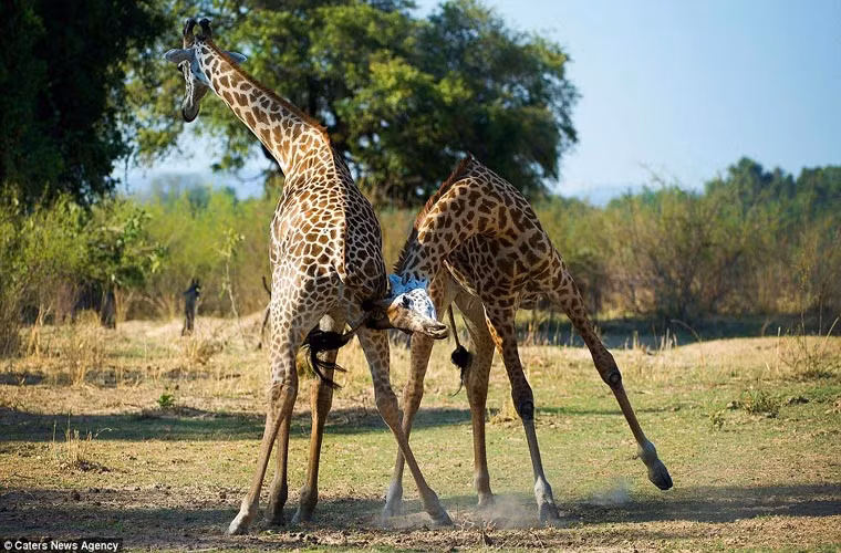 Những con hươu cao cổ đực đập mạnh, chà xát và xoắn cổ vào với nhau để đọ sức xem ai mạnh hơn. Mặc dù hành động "âu yếm bằng cổ" khiến chúng trông rất dễ thương, nhưng những cuộc chiến đấu như thế này của loài hươu lại khá nặng nhọc và có thể kéo dài 20 phút. Tuy nhiên, hành động này cũng là cách để con hươu đực thu hút sự chú ý của những con hươu cái khác.