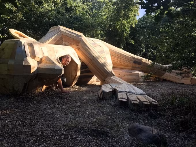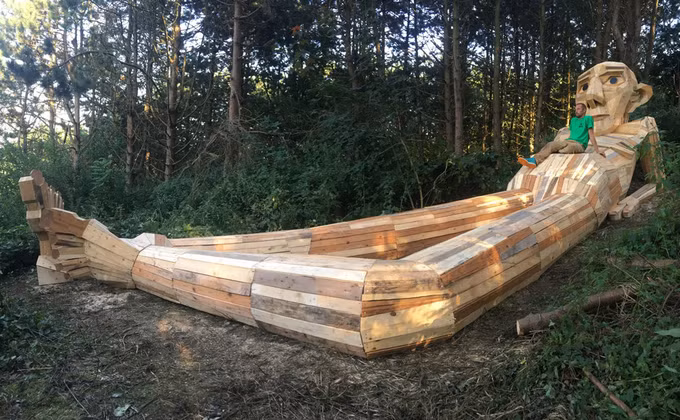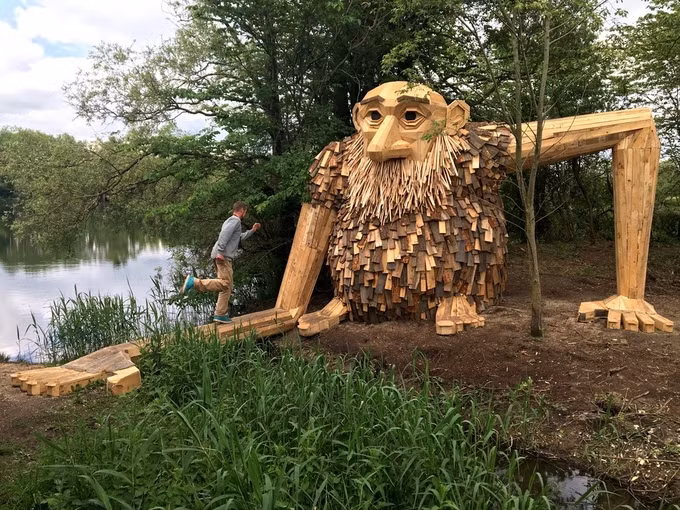 Nghệ sĩ Đan Mạch Thomas Dambo (áo trắng) cùng các đồng sự đã sử dụng những vật dụng bỏ đi để tái chế, tạo nên bộ 6 bức tượng "Những gã khổng lồ bị lãng quên", đặt rải rác ở thủ đô Copenhagen, Đan Mạch.
