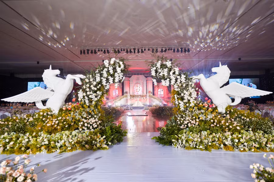 Không gian cưới đậm chất cổ tích của cặp đôi Khánh Thi và Phan Hiển được phủ đầy hoa tươi cùng ánh đèn rực rỡ. |