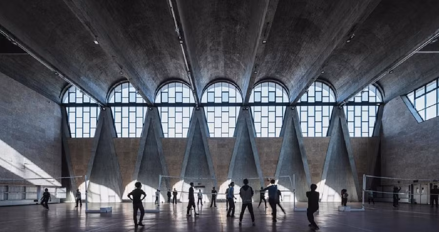 Nhiếp ảnh gia Trung Quốc (TQ) Terrence Zhang đã chụp được bức ảnh ở góc độ giới thiệu tốt nhất nét độc đáo của phòng tập thể dục thuộc Đại học Thiên Tân (TQ) với những khối bê tông thô vừa mạnh mẽ vừa mềm mại.