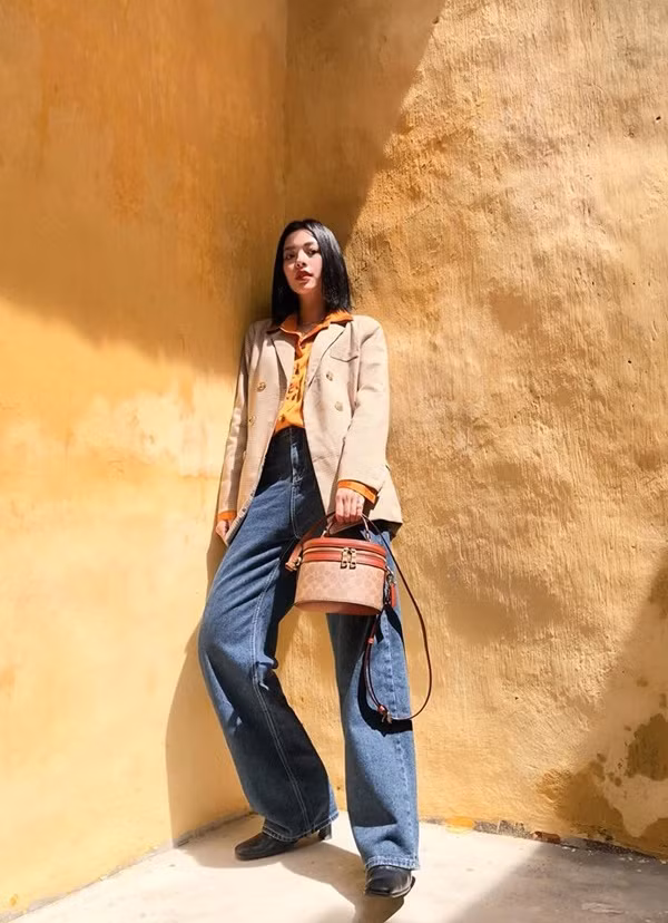 Tú Hảo xây dựng hình ảnh quý cô cổ điển khi đi chơi Tết với set đồ gồm sơ mi nâu, blazer và mẫu quần jeans ống suông.