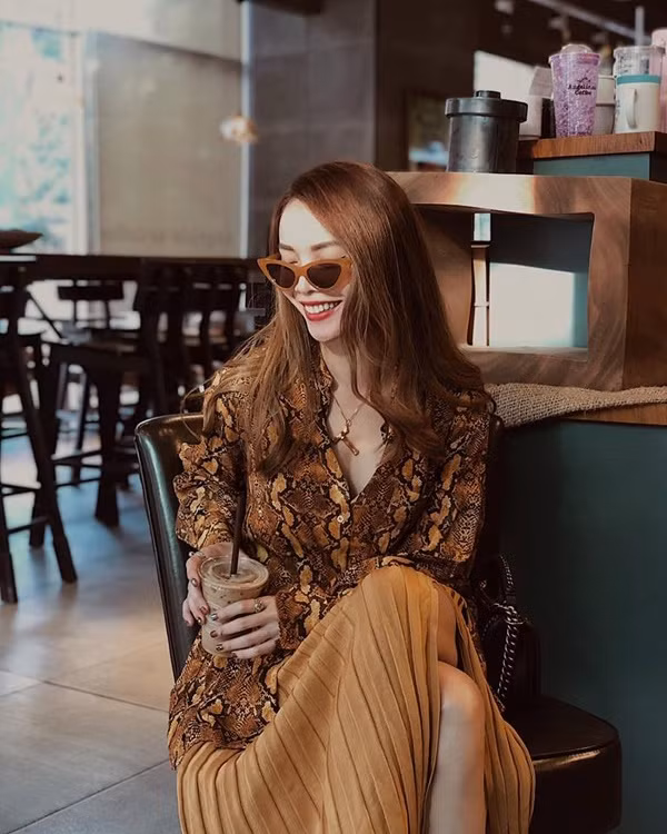 Sơ mi họa tiết da trăn tông nâu hợp mốt được Yến Trang phối cùng chân váy dập ly tông màu hài hòa. Set đồ này sẽ mang lại sự thoải mái cho người mặc khi đi làm hoặc xuống phố cà phê cùng bạn bè.