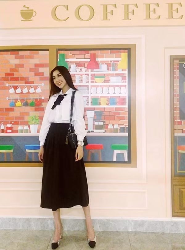 Sơ mi trắng là một trong những mẫu áo được các sao Việt yêu thích ở mùa xuân này. Tường Linh trẻ trung như nữ sinh với dáng sơ mi cơ bản mix cùng chân váy midi. Mẫu túi Gabrielle tông đen và giầy Chanel được người đẹp lựa chọn để hoàn thiện set đồ.