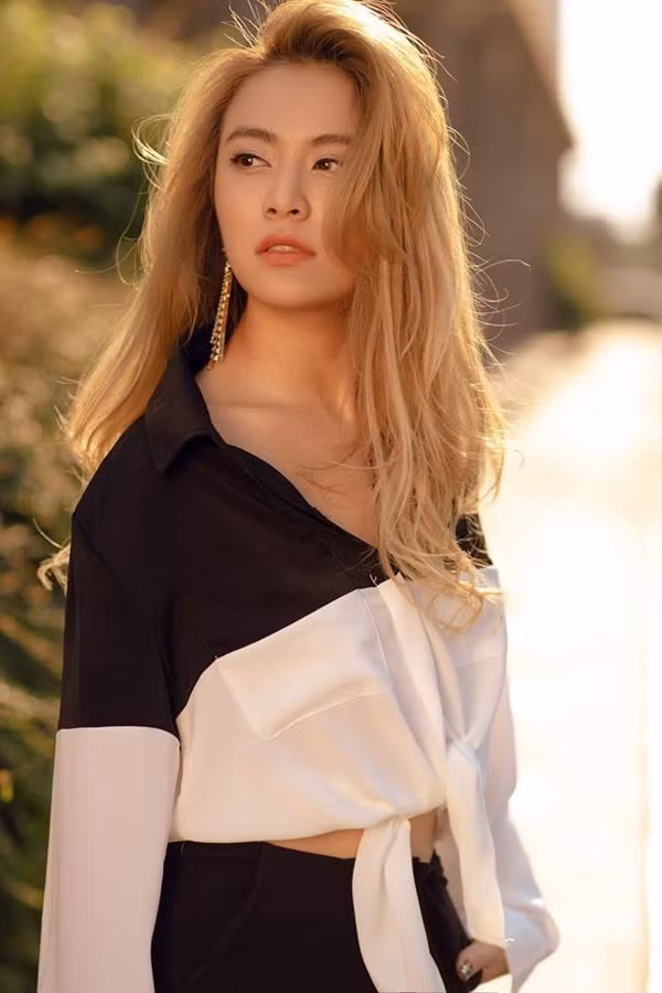 Sơ mi sệ vai mang lại cảm giác thoải mái được Hoàng Thùy Linh phối cùng quần âu đồng điệu sắc màu. Cách quấn vạt áo vừa tạo điểm nhấn vừa giúp người mặc tôn nét gợi cảm.