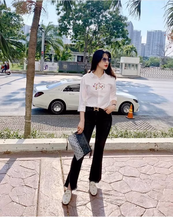 Diệp Lâm Anh chọn áo thêu họa tiết chú lợn mang phong cách tranh dân gian Đông Hồ để mix đồ dạo phố. Phụ kiện đi kèm là giầy slip on Gucci và clutch của Louis Vuitton.