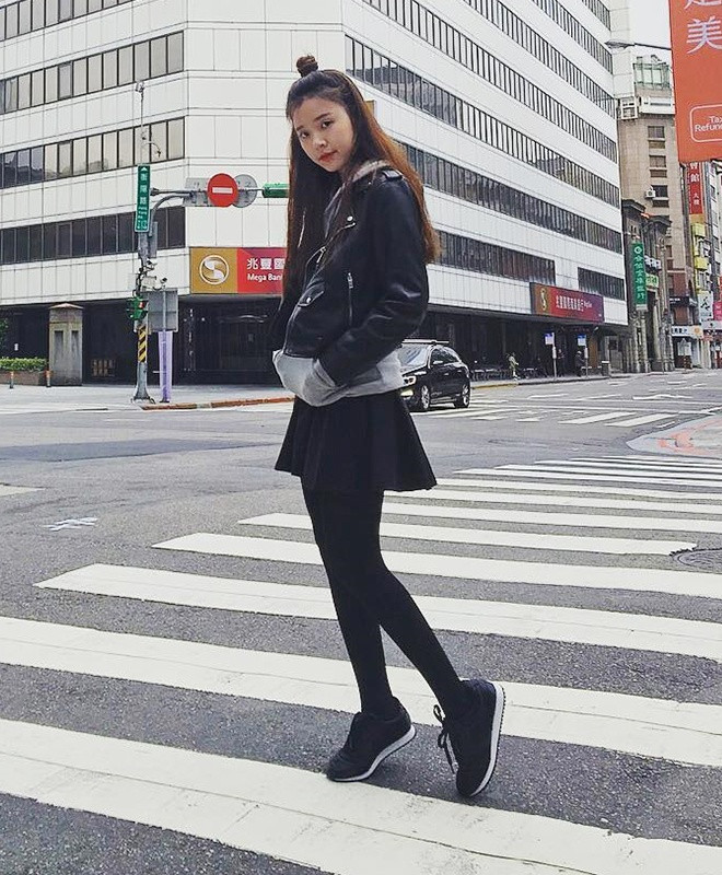| Người đẹp sinh năm 1989 luôn biết cách "ăn gian" tuổi tác qua cách chọn trang phục và làm tóc. Cô thực hiện búi tóc hình củ tỏi nhỏ trên đỉnh đầu, đồng thời chọn set đồ cây đen gồm áo khoác da, chân váy xếp ly, quần tất và giày sneakers trẻ trung. |