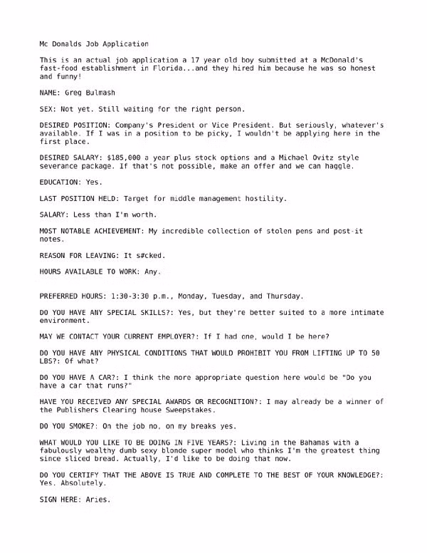 Đó là nội dung có trong lá đơn hết sức bá đạo của một thiếu niên 17 tuổi gửi chi nhánh hãng McDonald’s ở Florida. Lá đơn xin việc của cậu đã khiến ai nấy phải bật cười vì nội dung hết sức thật thà. Kết quả là thanh niên này đã được tuyển dụng bởi sự trung thực và hài hước.