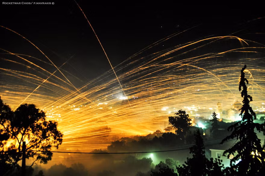 2. Lễ hội cuộc chiến tên lửa là một sự kiện được tổ chức hằng năm vào Lễ Phục sinh trên đảo Chios, Hy Lạp. Tại đây, hai nhà thờ của 2 giáo xứ đối địch là Agios Markos và Panagia Erithiani nằm trên sườn đồi đối diện và bắn hàng nghìn tên lửa tự chế vào tháp chuông của nhau. Tên lửa là những thanh gỗ chứa hỗn hợp nổ làm từ than củi, nitơ và lưu huỳnh. Ngay khi tiếng chuông đánh dấu sự phục sinh của Chúa Giê-su vang lên, bầu trời tràn ngập những tia sáng đầy màu sắc và tiếng lách cách của hàng ngàn tên lửa.