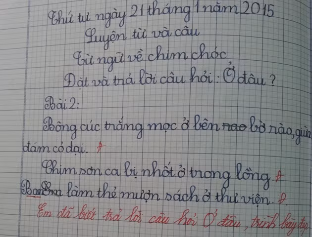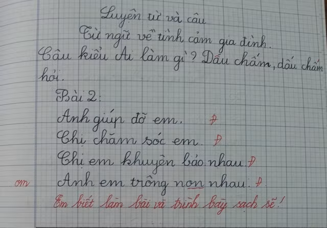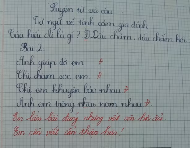 - Chữ viết của con đều và sạch sẽ! Nhưng chữ sẽ đẹp hơn nếu nhỏ nét khuyết mà cô gạch chân lại một chút!