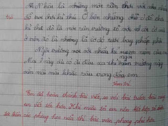 - Em đã hoàn thành bài viết, so với bài trước, bài này em viết tốt hơn. Khi miêu tả, em nên kết hợp đặc điểm các phòng học nữa thì bài văn phong phú hơn.