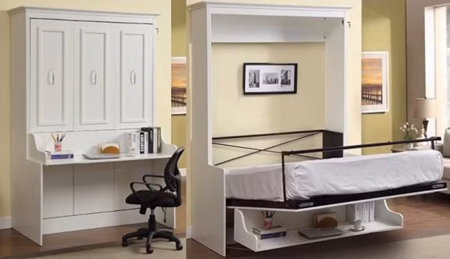 Một kiểu tủ kèm với bàn làm việc và giường ngủ có thể gấp gọn rất phù hợp với nhà có diện tích nhỏ.