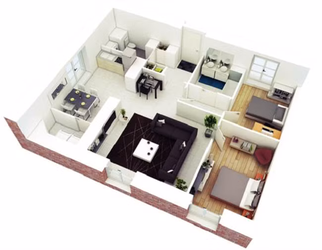 Thông thường, bạn sẽ được khuyên kết hợp phòng khách và phòng bếp gộp chung để tiết kiệm không gian. Tiếp đó là 1 phòng ngủ rộng, được xem như là phòng sinh hoạt chung, 1 phòng ngủ có diện tích nhỏ hơn dành cho các bé. Phần cuối của nhà là nhà vệ sinh, giặt giũ và phơi phóng.