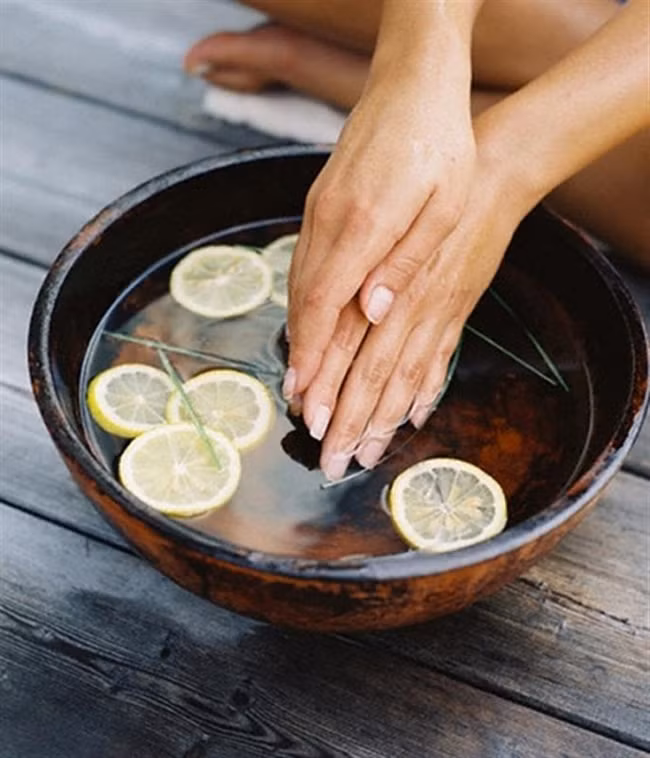 Chỉ cần ép nước chanh tươi vào một bát nước ấm, và sau đó ngâm móng tay vào các vết bẩn cúng đầu sẽ được đánh bóng sạch sẽ trong vòng 5 phút. Các axit trong chanh sẽ tác động vào các vết bẩn trên móng.