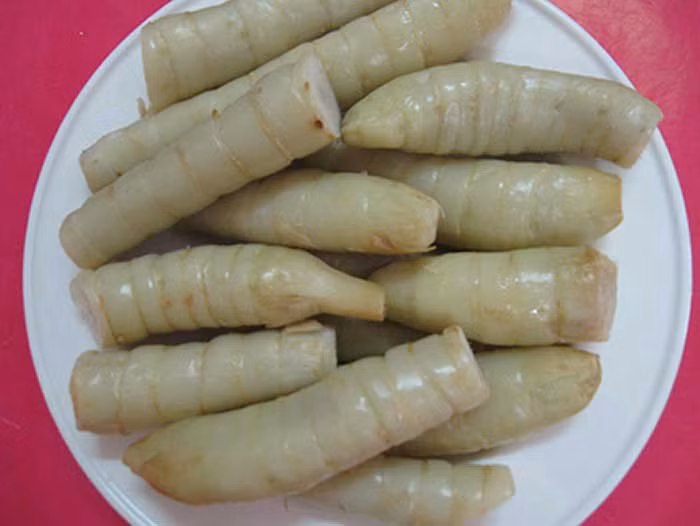 Củ dong riềng luộc: Ăn món này thì ngọt, bùi, ngon tuyệt cú mèo. Luộc một nồi rồi ngồi ăn mãi cũng được. Chỉ có điều ăn dong riềng xong là phải xỉa răng đến mệt vì xơ mắc vào các kẽ răng.