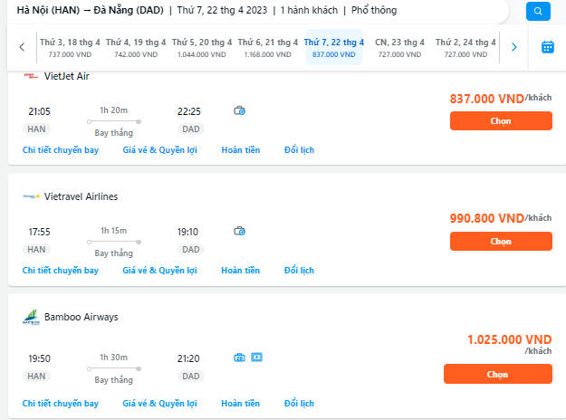Giá vé máy bay Hà Nội - Đà Nẵng thường dao động từ 837.000 đến 2.531.000 VNĐ/chiều/khách tùy thuộc vào từng hãng hàng không, thời điểm đặt vé và các chương trình khuyến mãi hiện có.
