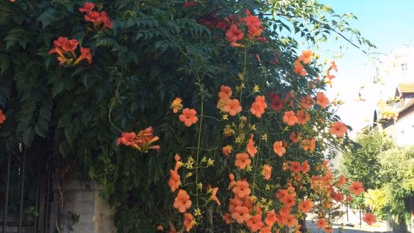 Một con đường nhỏ lát đá, gồ ghề và láng bóng, uốn theo hai dãy nhà sơn đủ màu sắc bên đường. Sắc tím của tử đằng, mầu cam của lan tiêu, điểm thêm vài chùm hoa ti-gôn, phủ đầy mặt tiền ngôi nhà, vươn sang cả hàng rào và chiếc cổng sắt chỉ nhỉnh hơn đầu người, mang tính trang trí hơn là chống trộm.