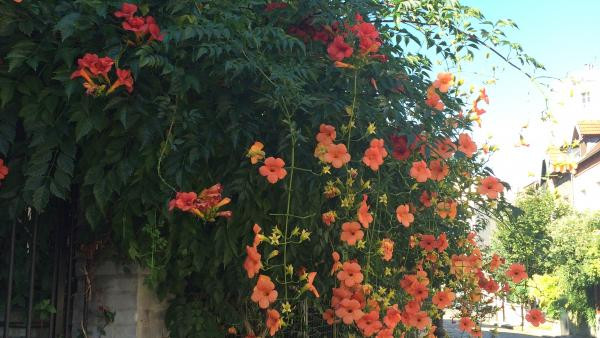 Một con đường nhỏ lát đá, gồ ghề và láng bóng, uốn theo hai dãy nhà sơn đủ màu sắc bên đường. Sắc tím của tử đằng, mầu cam của lan tiêu, điểm thêm vài chùm hoa ti-gôn, phủ đầy mặt tiền ngôi nhà, vươn sang cả hàng rào và chiếc cổng sắt chỉ nhỉnh hơn đầu người, mang tính trang trí hơn là chống trộm.