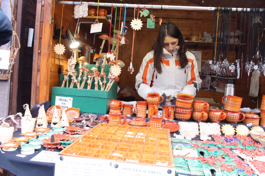 Tại quảng trường phía trước Bảo tàng quốc gia Czech, một Hội chợ Giáng sinh cũng được tổ chức với hai dãy quầy hàng dựng bằng gỗ, cổ điển và duyên dáng. Cây thông trang trí bằng pha lê, một sản phẩm đặc trưng của Czech được trưng bày tại Hội chợ, thu hút sự chú ý của du khách. Những món đặc sản Czech được chế biến ngay trước mắt du khách, tỏa mùi thơm quyến rũ. Khó có thể bỏ qua những món ăn nóng trong lúc tuyết nhẹ bay, cái lạnh ngọt ngào khiến ta muốn tận hưởng một chút thức ăn nóng, kèm ly vang nóng bốc khói thơm.