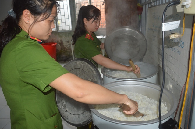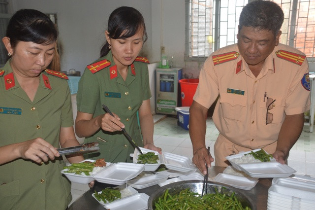 Trung tá Mạch Dĩ Nhiên, Phó Trưởng công an huyện cho biết: “Nhiều năm qua, CBCS công an huyện chúng tôi vừa đóng góp, vừa vận động các nhà hảo tâm đóng góp để nấu cơm phục vụ các thí sinh tham dự kỳ thi. Mỗi phần cơm có thịt, rau xào, canh và nước uống. Sáng các chiến sĩ đi chợ mua thực phẩm tươi ngon, về tranh thù chia nhau nấu và chia phần.