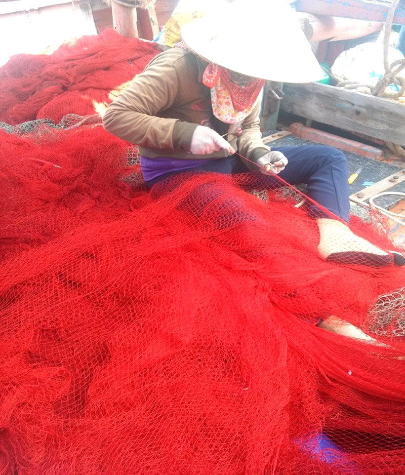 Một phụ nữ đang đan lưới trên boong tàu đánh cá ngừ đại dương