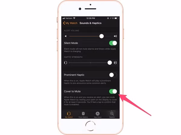 Để bật tính năng này, hãy truy cập ứng dụng Watch và tìm kiếm Sound & Haptics > Cover to Mute.