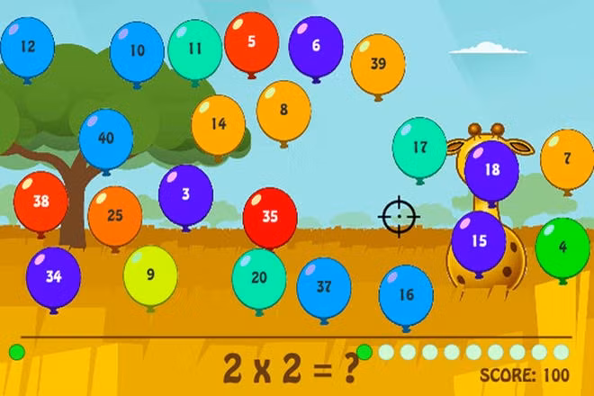 Trò chơi này cũng tương tự như trò Times tables shooting, chỉ khác là lần này trẻ sẽ bắn vào bóng bay. Trò chơi này không những rèn con tính toán, mà nó còn luyện cho trẻ nhanh mắt. Bởi trong một rừng bóng bay như thế, con phải lựa chọn đáp án đúng thật nhanh. Hoàn thành xong 10 bài toán nhỏ thì con chiến thắng.