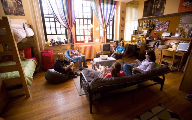 Ở trong nhà nghỉ tập thể với tối đa 15 người mỗi phòng