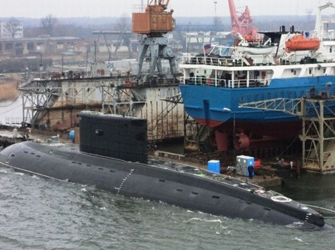 Bên cạnh việc cung cấp tàu ngầm, Nga cũng sẽ giúp Việt Nam xây dựng căn cứ tàu ngầm và một cơ sở sửa chữa bảo trì. Trong ảnh là tàu ngầm lớp Kilo 636 có tên Hà Nội tại một cảng gần Kaliningrad. Ảnh: Shipspotting