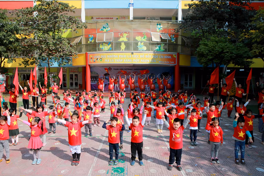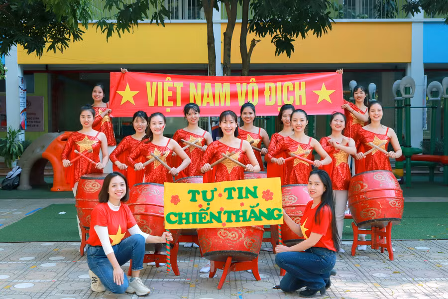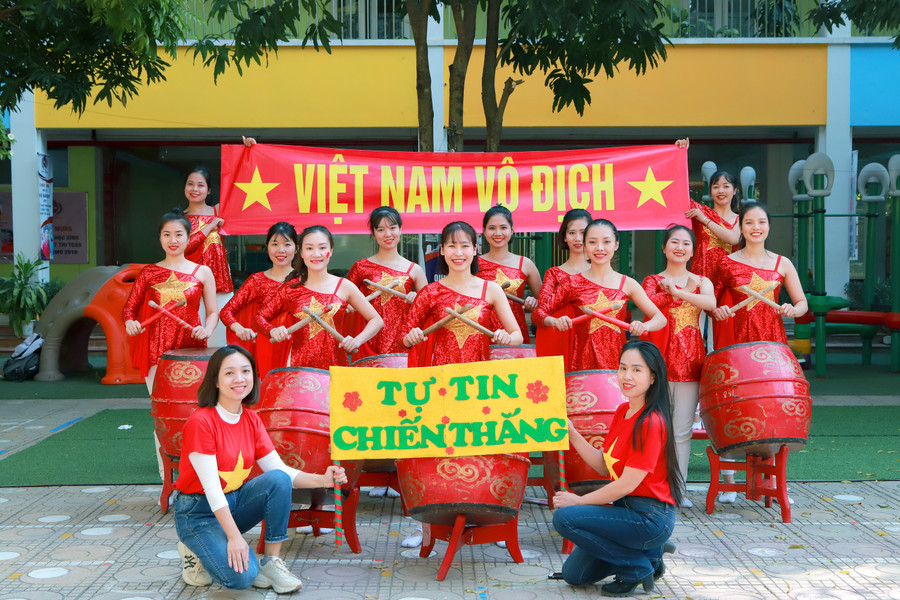 Hòa chung bầu không khí cuồng nhiệt cổ vũ bóng đá của người hâm mộ Việt Nam, để “truyền lửa” cho đội tuyển nước nhà, cô và trò trường Mầm non Thăng Long Kidsmart đã cùng nhau tổ chức Ngày hội Thể thao, “nhuộm đỏ” sân trường bằng những chiếc áo cờ đỏ sao vàng và gửi những lời chúc tốt đẹp tới các cầu thủ.