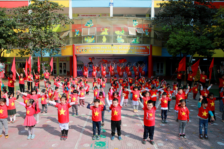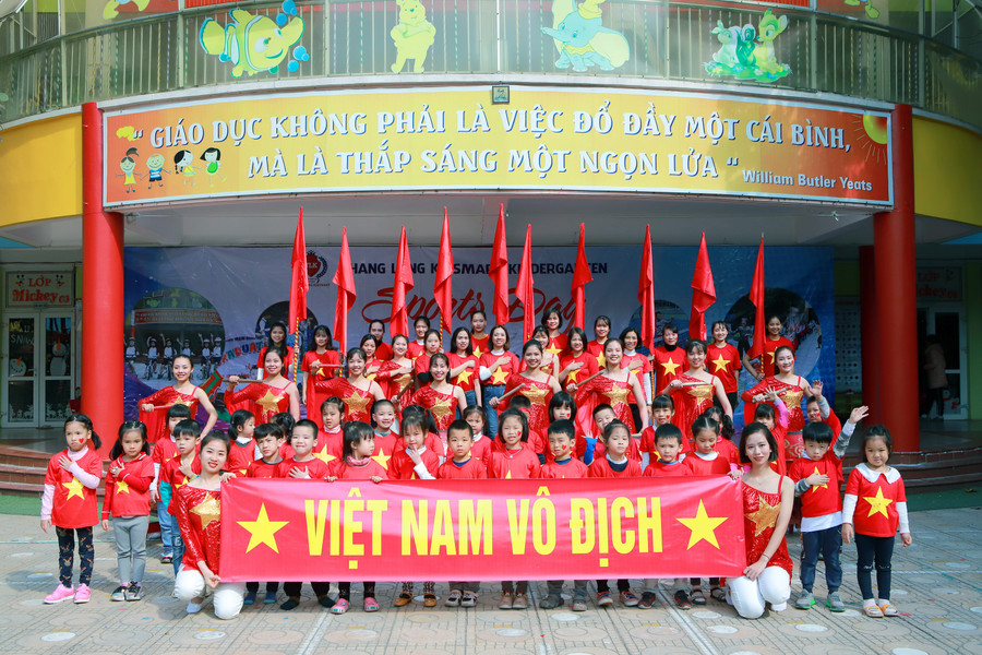 Với những màn đồng diễn võ thuật, trống hội, hát múa, nhuộm đỏ sân trường với áo cờ đỏ sao vàng, cô và trò trường Mầm non Thăng Long Kidsmart muốn tiếp thêm sức mạnh tinh thần, truyền lửa cho các cầu thủ U22 Việt Nam và gửi lời chúc đội tuyển U22 Việt Nam vô địch, đem vinh quang về cho Tổ quốc.