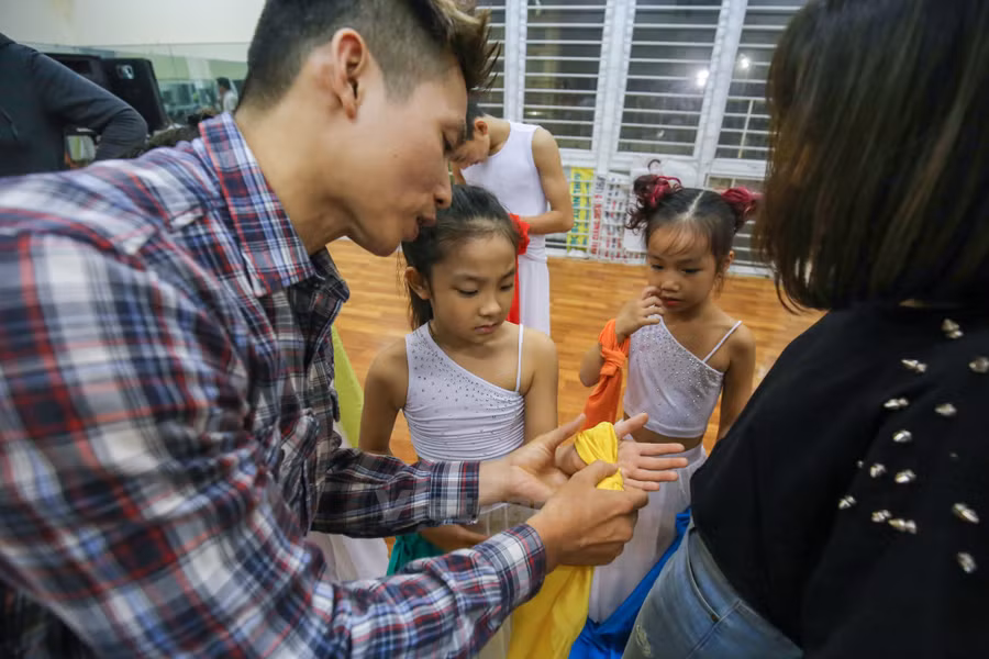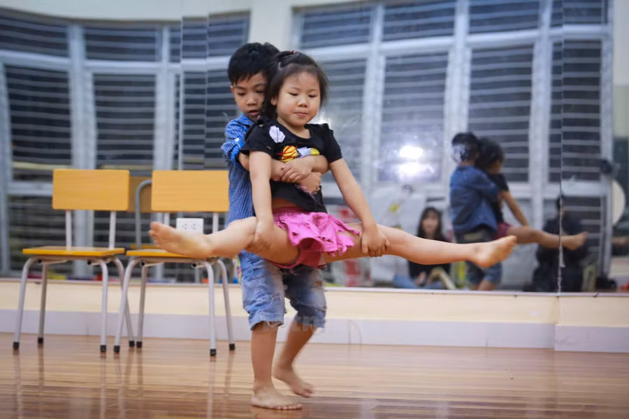 Tập luyện vũ đạo chấn thương là chuyện bình thường, nhất là trẻ con chỉ cần mất tập trung một chút thôi là có thể bị ngã đâu. Hai vợ chồng Viết Thành và Quỳnh Trang rất vất vả để tập trung dạy dỗ các bé. (Ảnh: Minh Sơn/Vietnam+)