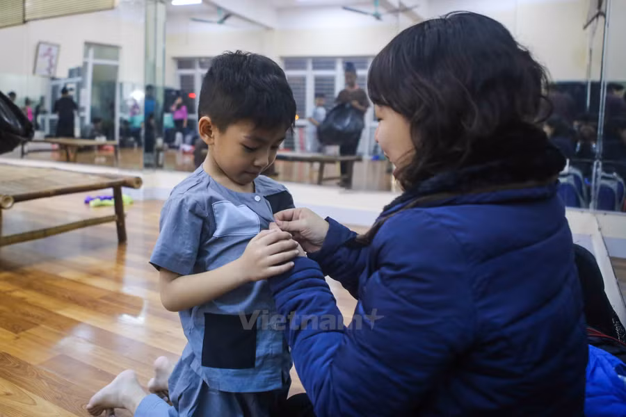Bé Gia Huy, 6 tuổi được chị Hường – mẹ bé tận tay chăm sóc con đến cuối buổi. Chị cho biết, cháu thích nhào lộn nên cho con tập bộ môn hiphop. Vừa muốn con mình rèn luyện sức khỏe vừa giúp bé tự tin hơn. (Ảnh: Minh Sơn/Vietnam+)